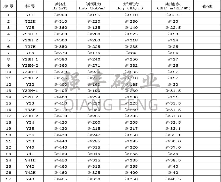永磁铁氧体是以SrO或BaO及三氧化二铁为原料,通过陶瓷工艺方法制造而成,公司永磁部所生产的锶、钠、铁氧体共有Y8T、T22H、Y25、Y26H-1、Y27H、Y28、Y30H、Y32、Y43等多个牌号和粘结(塑磁)永磁铁氧体。